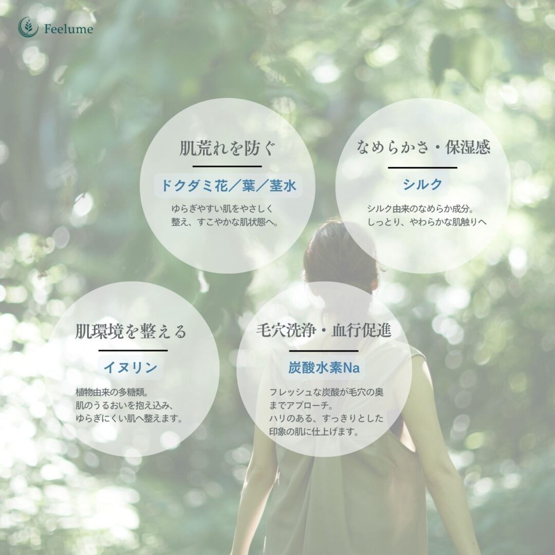 ベースには、ドクダミ花・葉・茎水を贅沢に配合。